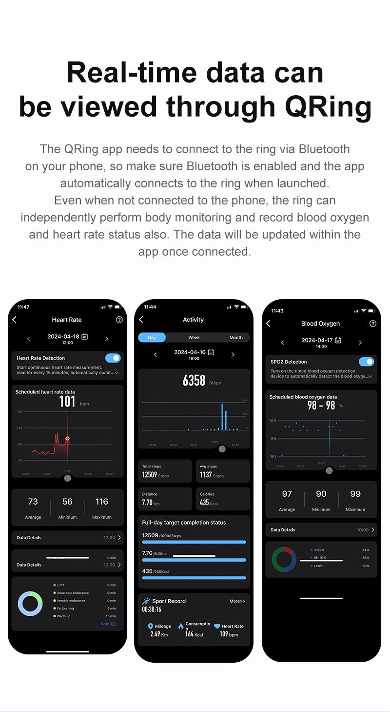 Sync to the QRING app to review sleep, activity, heart-rate trends, and SpO₂ insights. Clear dashboards help you understand patterns not just numbers.