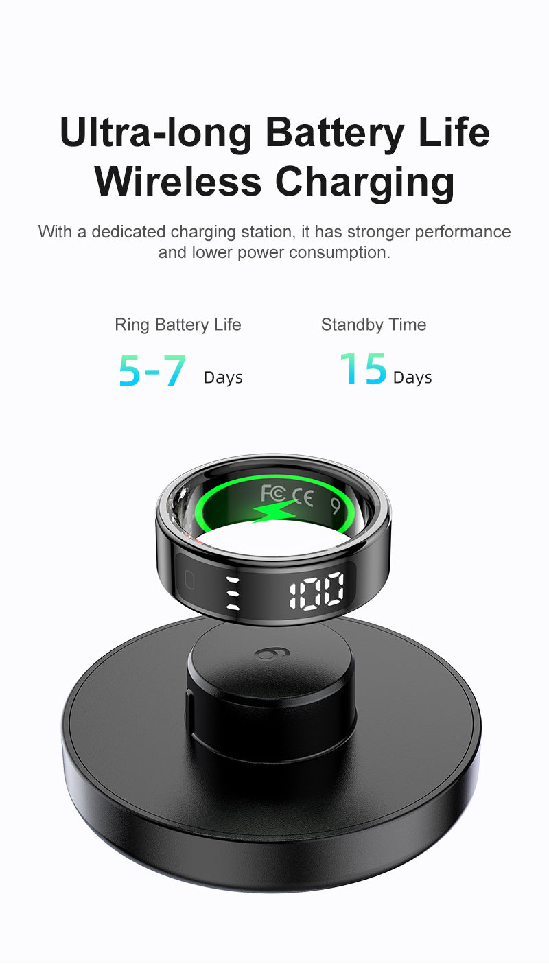 Display: Multi-functional on-ring display (time/steps/heart/battery)
